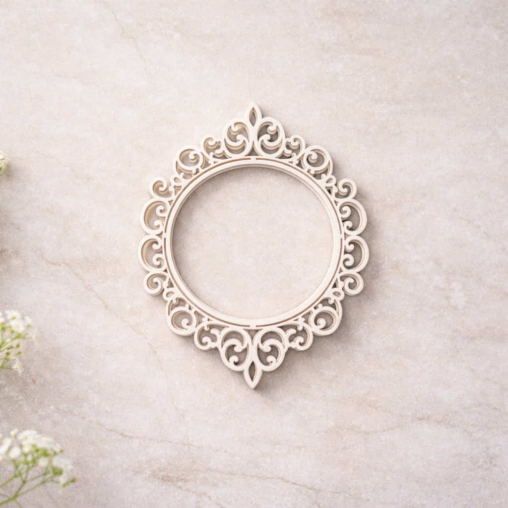 Elegancka, ażurowa ramka okrągła o bogatym, dekoracyjnym wzorze z finezyjnymi zawijaskami. Warstwowa konstrukcja nadaje całości efekt przestrzenności i subtelnej głębi, dzięki czemu ramka prezentuje się wyjątkowo efektownie.