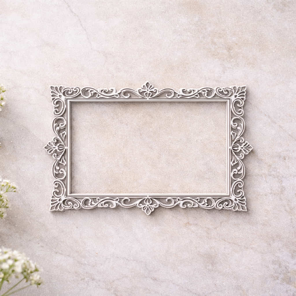 Ornamentowa forma doskonale sprawdzi się w projektach romantycznych, vintage, klasycznych oraz komunijnych. Ramka pięknie wyeksponuje zdjęcie, imię, datę lub cytat, stanowiąc centralny element kompozycji.