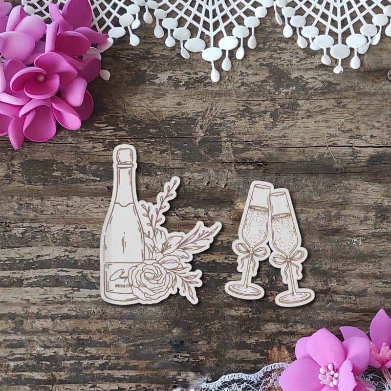 Zestaw grawerowanych tekturek „Szampan i kieliszki – toast i bąbelki” to elegancki i kreatywny dodatek do albumów, kartek okolicznościowych czy exploding boxów. W skład zestawu wchodzą: butelka szampana (ok. 4,2 × 5,5 cm) oraz dwa kieliszki (ok. 3 × 4,3 cm), wykonane z trwałej beermaty i precyzyjnie wycięte.