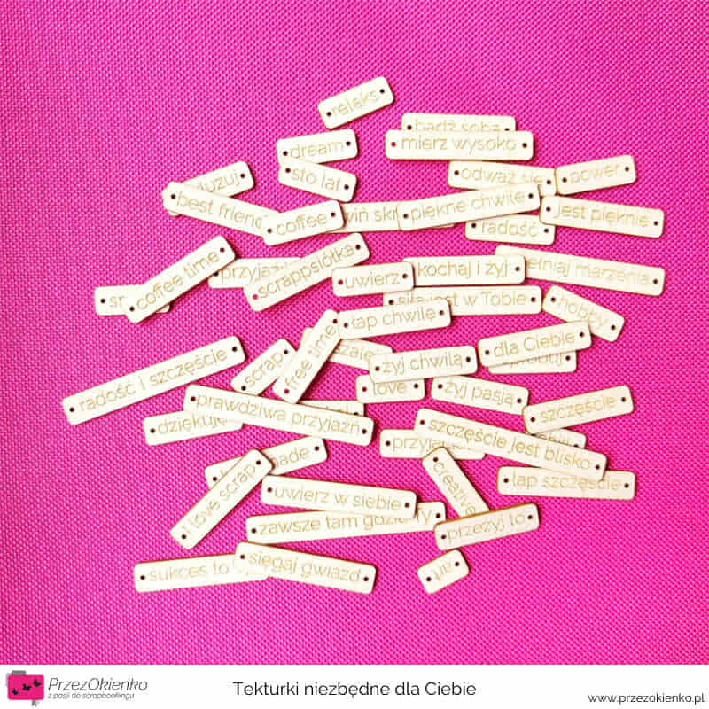 Zestaw 50 mini napisów – dedykowane głównie do naszych baz ATC. Do wyboru wersja z dziurkami na sznureczek (średnica dziurki ok. 1mm) lub bez dziurek. Idealnie sprawdzą się przy tworzeniu kart ATC, jak również w kartkach okolicznościowych, exploding boxach czy mini albumach.